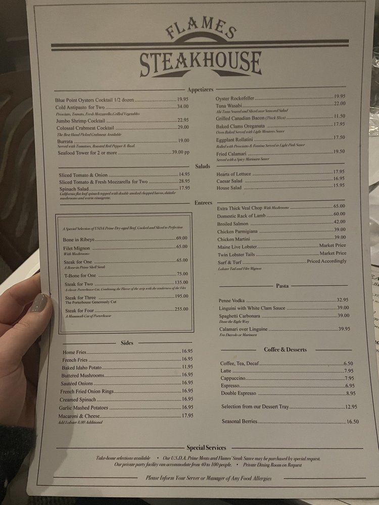 “ We were in the mood for a really good hamburger and decided to go to Flames. We had not been there in some time and found our experience to be outstanding- from the amazing wait staff to the food, we enjoyed the experience. We knew we wanted a hamburger but couldn't decide on another main dish and our waiter recommended the veal Parmesan. From the delicious complementary bread to the hamburger, done to perfection to the crispy fries that come with the burger, we completely satisfied our craving. And, for the veal parm our waiter suggested we add a few hot peppers on top. Always seeking the best veal parm, we came pretty close to that at Flames. The pounded veal chop was cooked to perfection with a little crisp, a thick not too sweet tomato sauce and the velvety burrata, created a dish that was incredible. Having recently gone to many mediocre, yet expensive restaurants, we found Flames a welcome reprieve, walking out not only satisfying our craving but enjoying everything about the meal in an ambiance that is not too loud and you can actually enjoy your meal and conversation. Overall Flames' food is better than many of the surrounding steakhouses and they do not nickel and dime you by charging extra for their steak sauce as so many other local steakhouses do. We will definitely return soon and eat a favorite of ours, their steak for two. ”